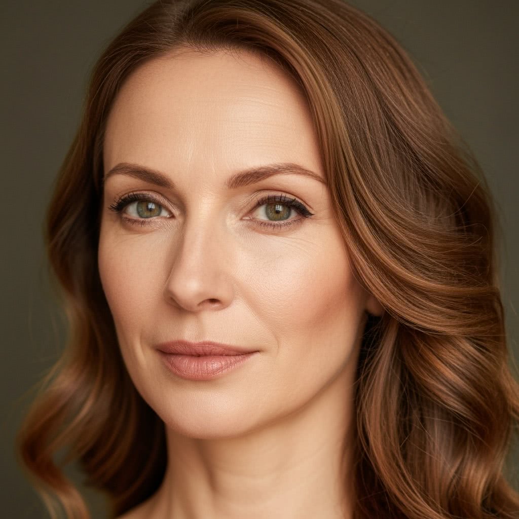 Oksana (30 years old) from Ukraine – Beauty type: Slavic; A woman with a soft oval face with gentle wrinkles near the eyes. Fair skin, slightly warm tone. Almond-shaped light brown eyes with subtle eyeliner. Straight nose. Hair light brown with natural shine, wavy. Lips in a soft natural shade.